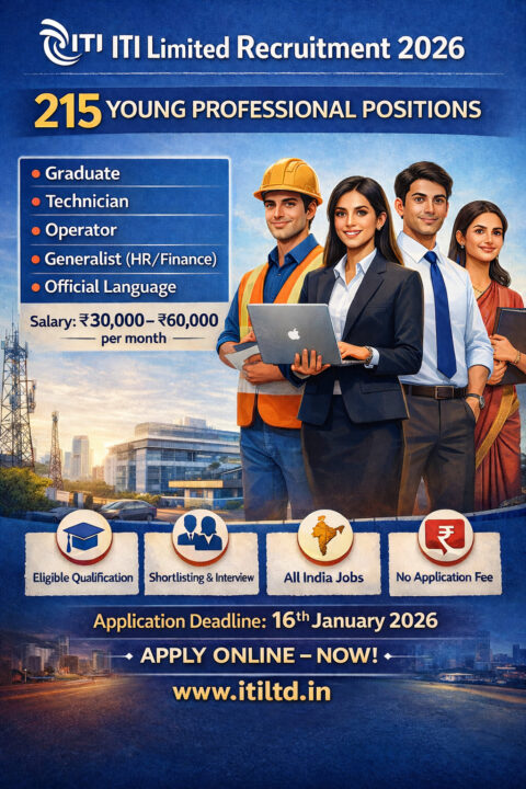 ಐಟಿಐ ಲಿಮಿಟೆಡ್ (Indian Telephone Industries Limited) ಯಂಗ್ ಪ್ರೊಫೆಷನಲ್ (Young Professional) ಹುದ್ದೆಗಳಿಗೆ 215 ನೇಮಕಾತಿಯನ್ನು ಪ್ರಕಟಿಸಿದೆ. ಆಸಕ್ತ, ಅರ್ಹರಾದ ಮತ್ತು ಭಾರತೀಯ ನಾಗರಿಕರು ಈ … Continue reading Indian Telephone Industries Limited (ITI Limited) ಹುದ್ದೆಗಳಿಗೆ ಅರ್ಜಿ ಆಹ್ವಾನ..